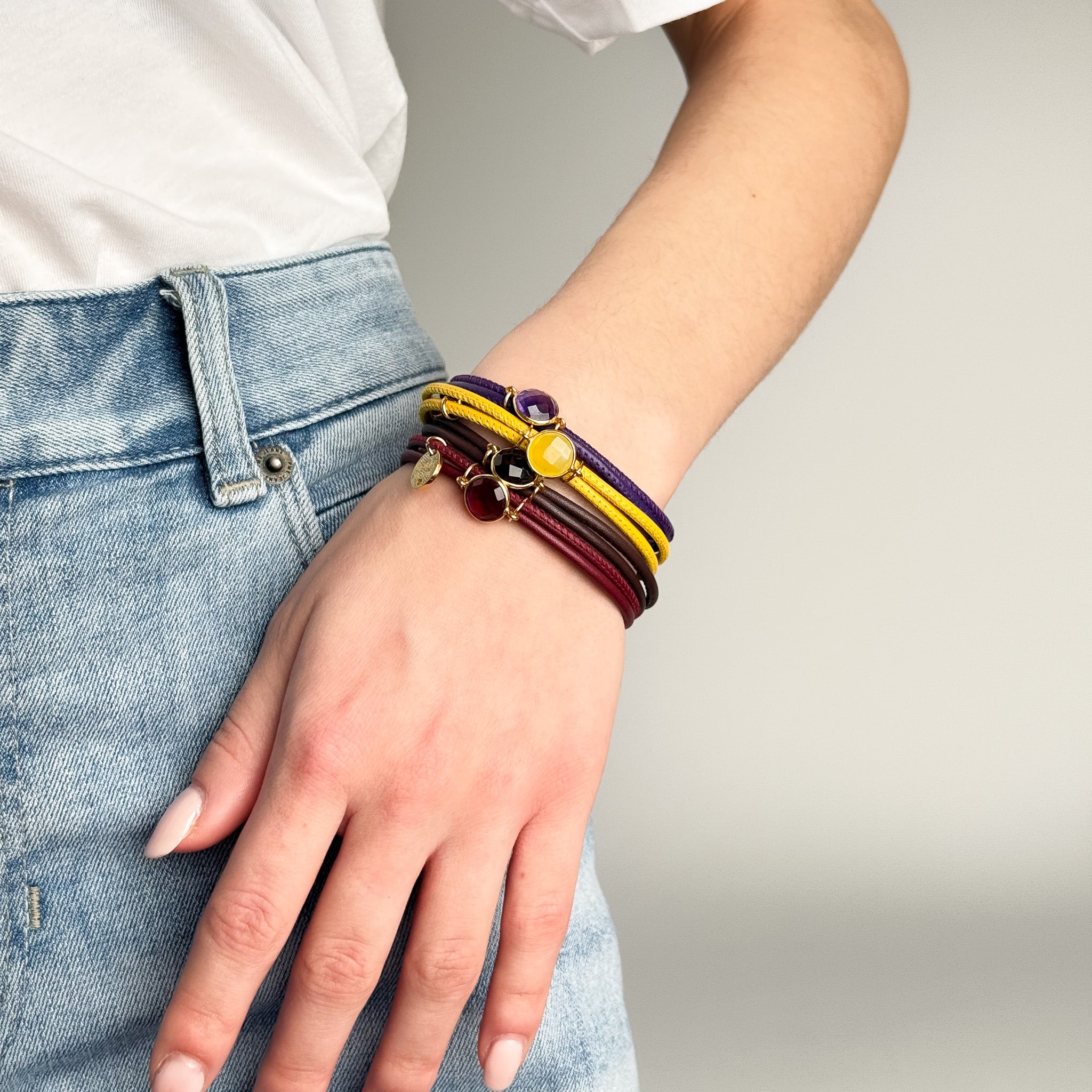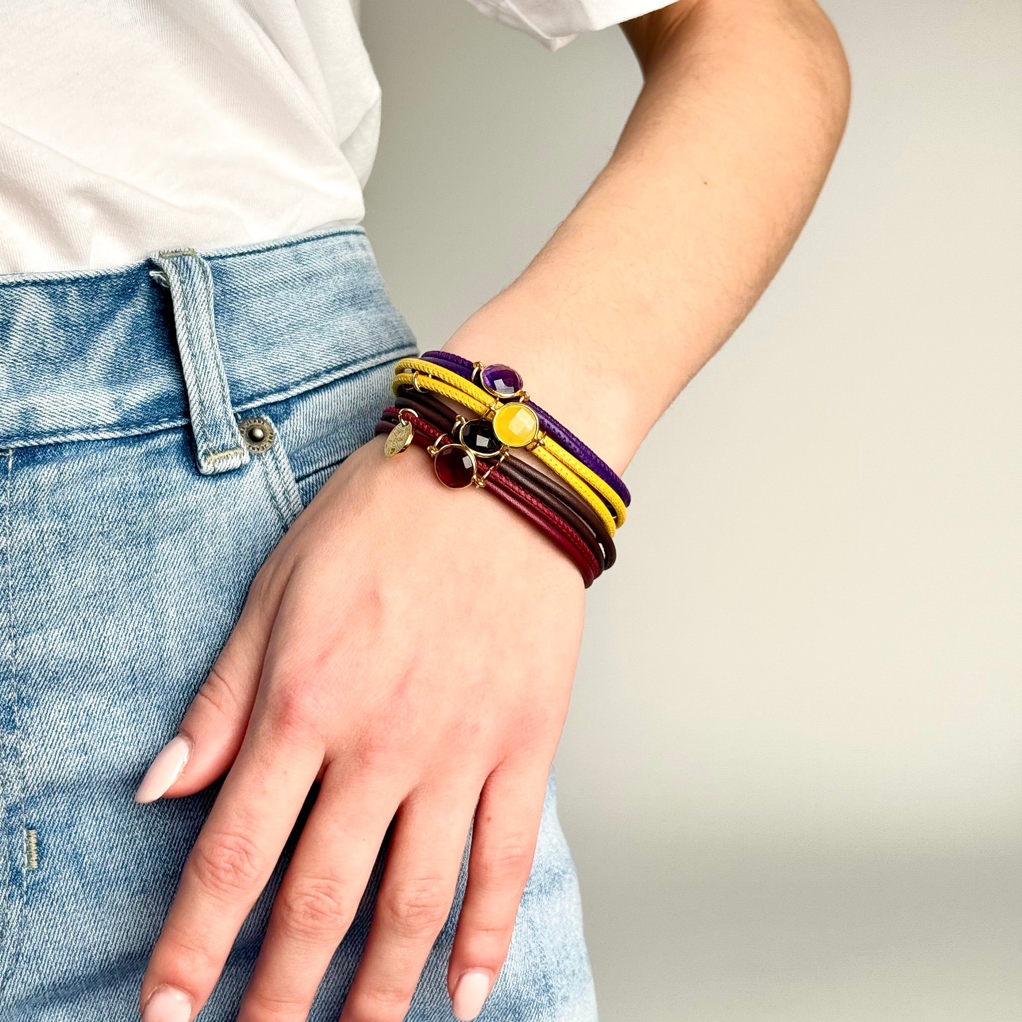 Zertifiziertes italienisches Leder, handgeschliffene Edelsteine – jedes Stück ein Unikat.